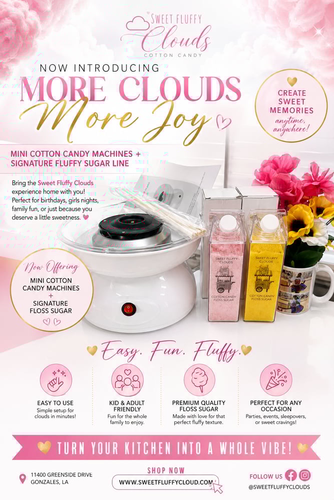 Bring the magic of Sweet Fluffy Clouds straight into your home with our exclusive Cotton Candy Experience Kit. This all-in-one set features a mini cotton candy machine paired with our signature fluffy floss sugar, giving you everything you need to create soft, delicious clouds in minutes.